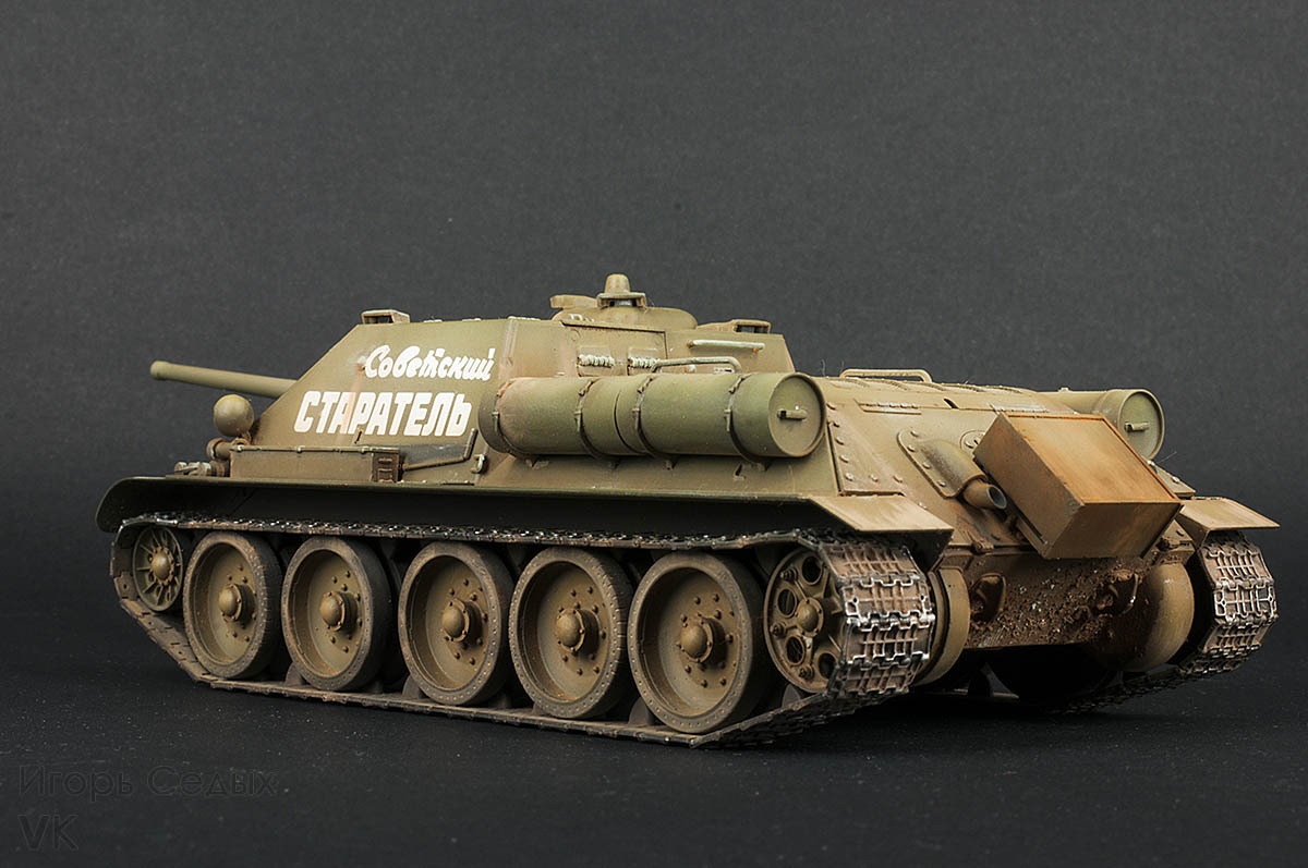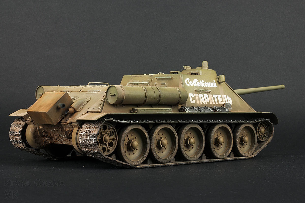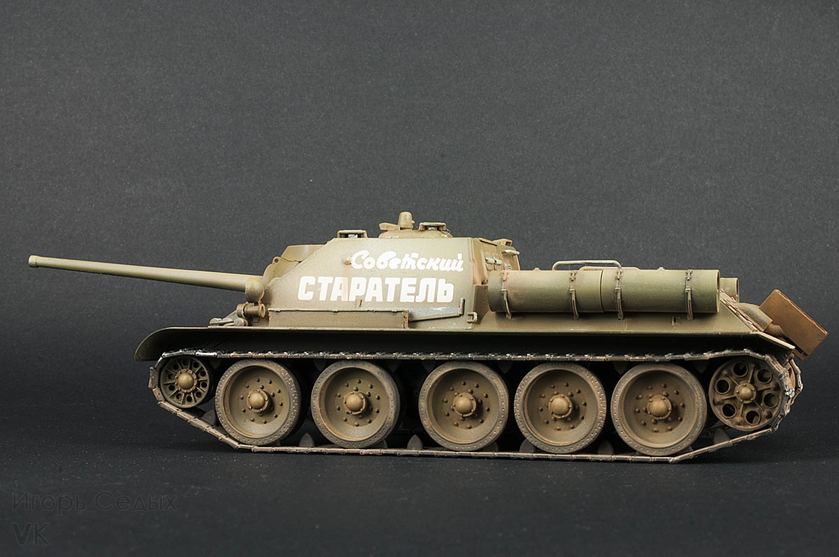 СУ-85 – средняя по массе советская самоходно-артиллерийская установка, относящаяся к классу истребителей танков. СУ-85 активно и успешно использовались с сентября 1943 года до окончания Великой Отечественной войны. Машины выпускались на Уральском заводе тяжёлого машиностроения (Уралмаш) с августа 1943 по июль 1944 года, всего было построено 2337 самоходок. 85-мм пушка Д-5С позволяла СУ-85 эффективно бороться со средними танками противника на дистанциях более километра, а на меньших дистанциях пробивать лобовую броню тяжёлых танков.