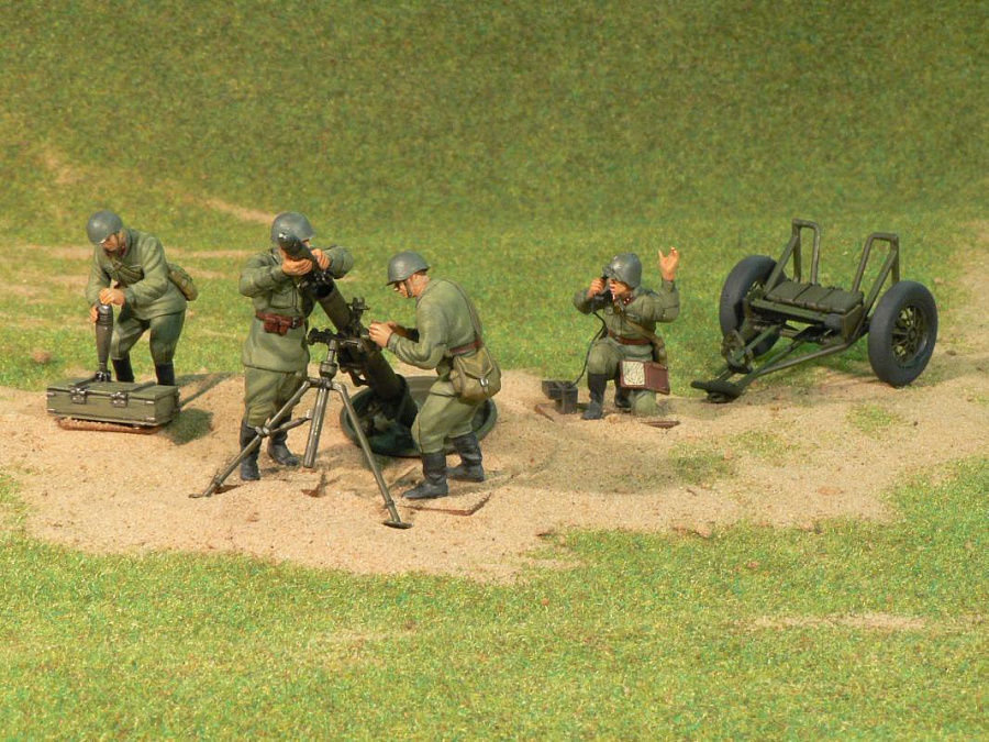 Набор состоит из модели миномета, передка и трех фигурок минометного расчета. Минометчики одеты в форму Красной Армии начального периода Второй Мировой войны (1939-1943 гг.) и вооружены карабинами системы Мосина.