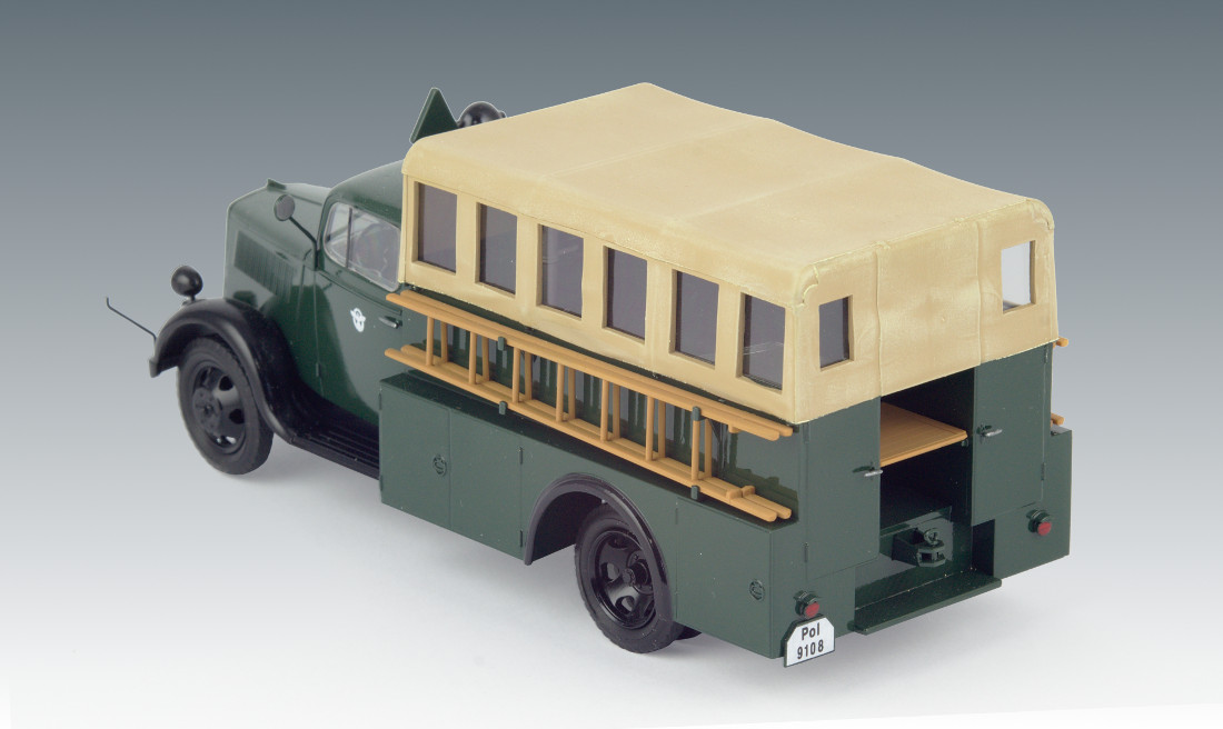 Детализированный сборный кузов с местами пожарного расчёта и отсеками для пожарного оборудования, крыша с имитацией брезентового покрытия.