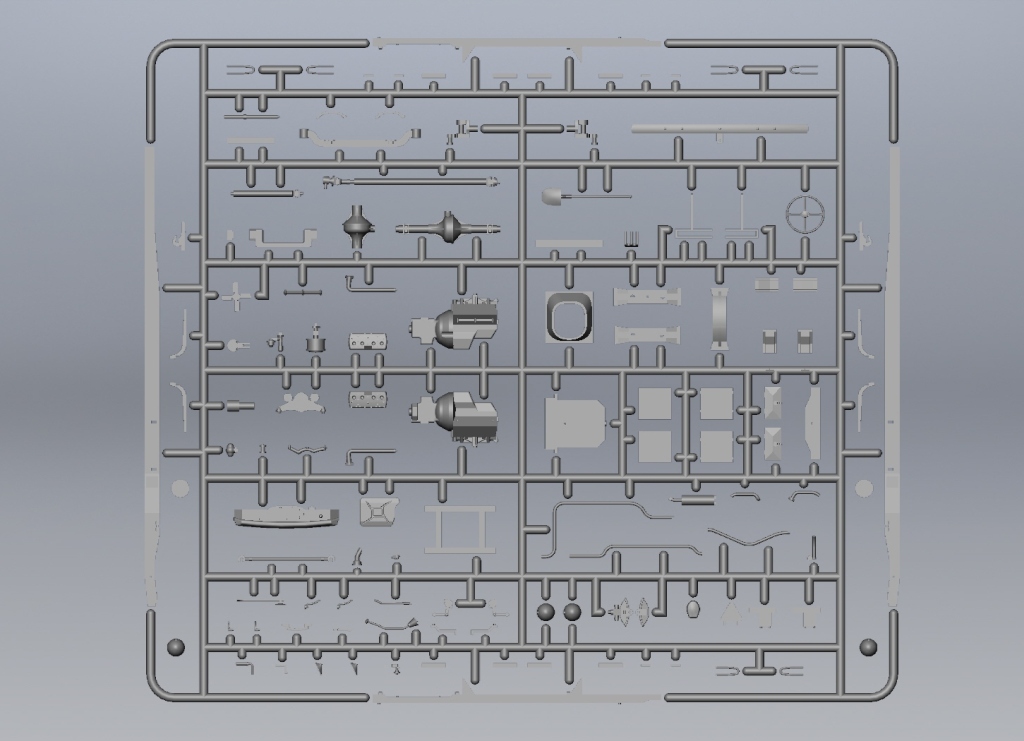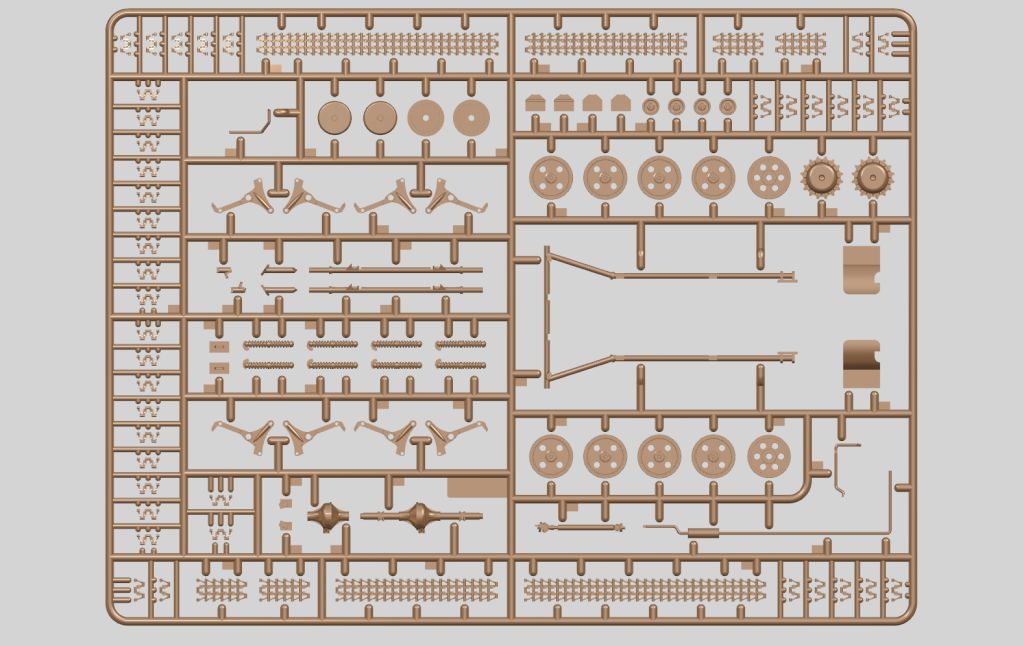 Детализированный гусеничный привод, пластиковая наборная гусеничная лента с прямыми участками, выполненными единой деталью, сборная несущая рама, выхлопная система выполнена отдельной деталью.