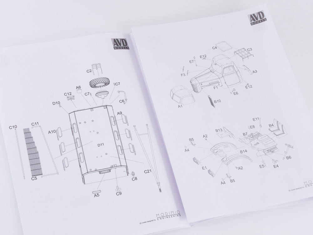 В комплект входит: металлический кузов, пластиковые детали для сборки одной модели, резиновые шины, декали и инструкция.