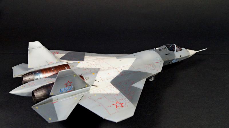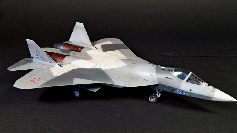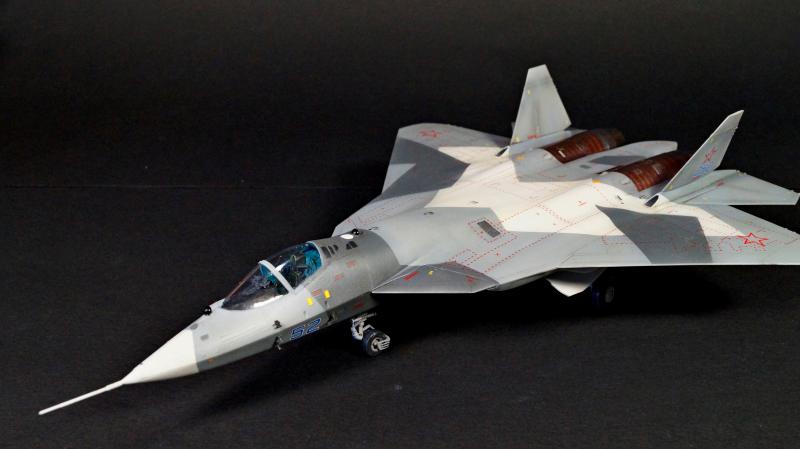 Набор для сборки модели истребителя ПАК ФА Т-50 в масштабе 1:72 состоит из пластиковых деталей и деталей из смолы (фигура лётчика и колёса).