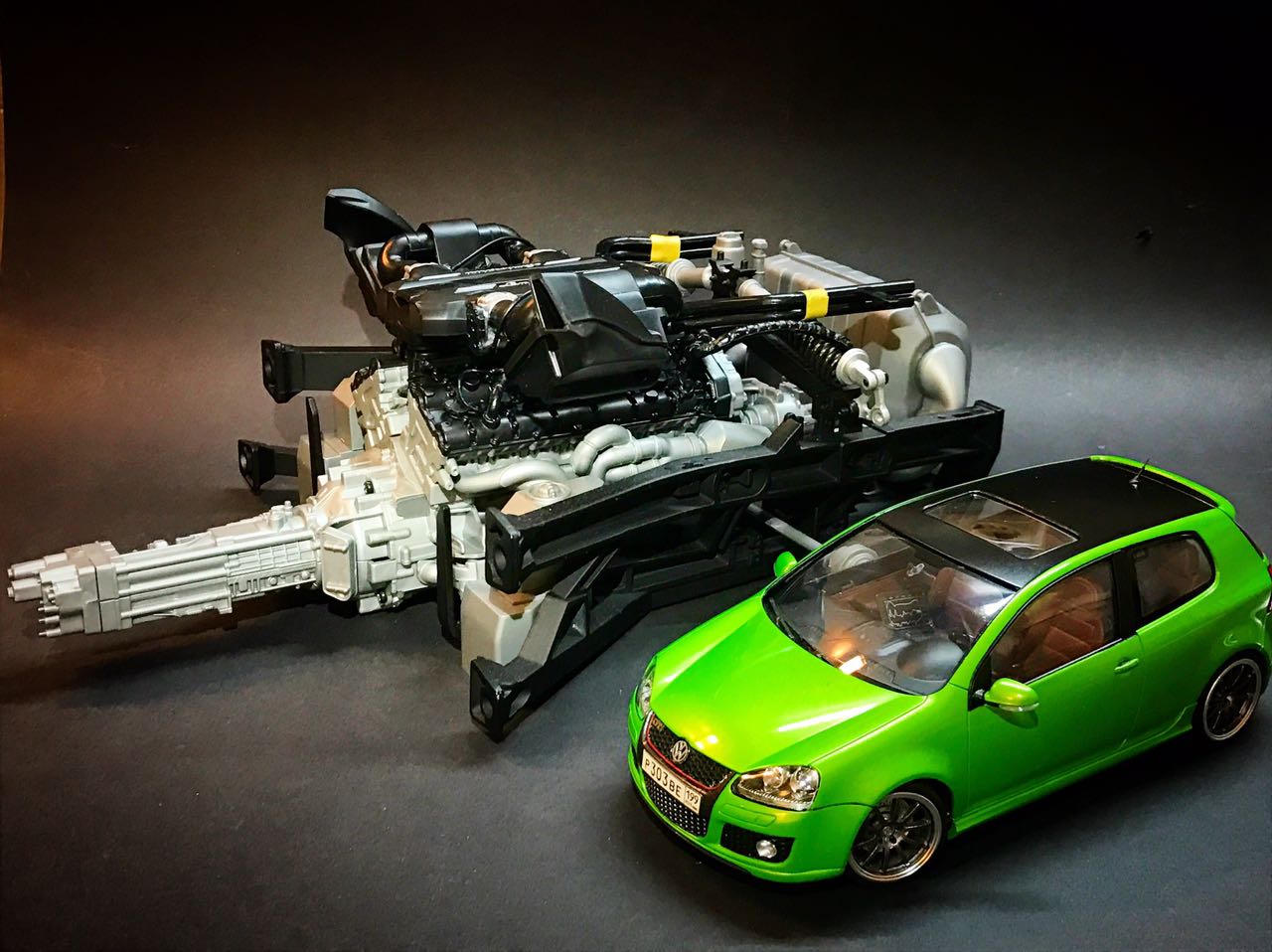 Сборная модель состоит из 814 деталей, изготовленных из различных материалов, включая металл, резину, текстиль и пластика премиум качества. Рулевое управление, подвеска и механизм спойлера функционируют наряду с открывающимися дверями, капотом и багажником. В собранном виде модель впечатляет своим размером - 595мм х 287мм х 144мм.