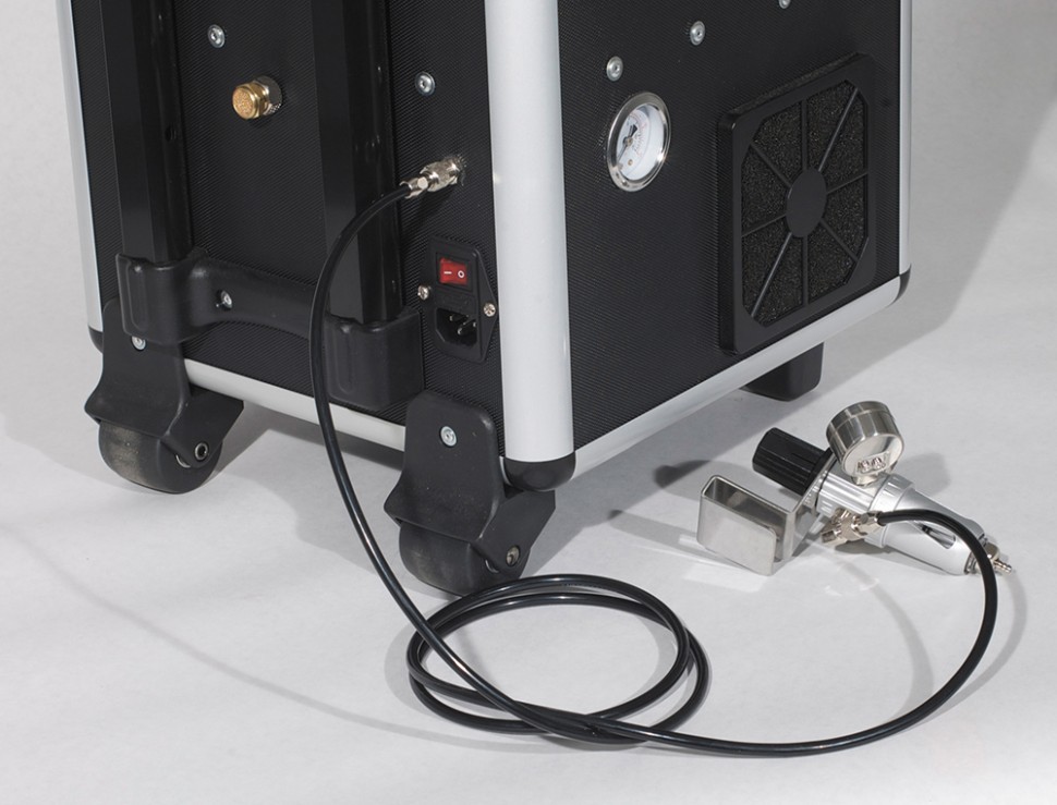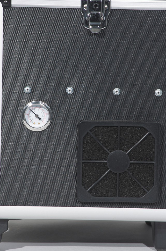 - В комплекте 3 шланга длиной 3 м с выходами 1/8" - 1/8", 2 шланга в оплетке с выходами 1/8" - 1/4", 2 запасных воздушных фильтра, запасной фильтр на всасываемый воздух, сетевой кабель и 2 ключа для запирания кейса.