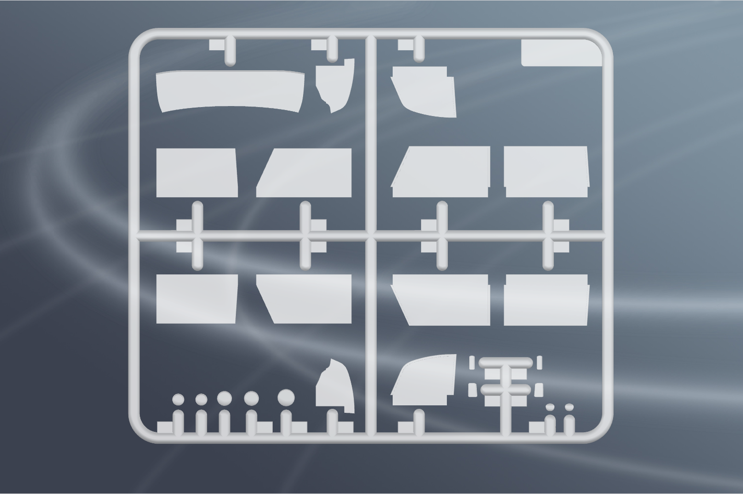 Детали из прозрачного пластика для стёкол фар, передних габаритных огней, остекление кабины выполнено отдельными деталями, вариант сборки с поднятыми или опушенными стёклами.