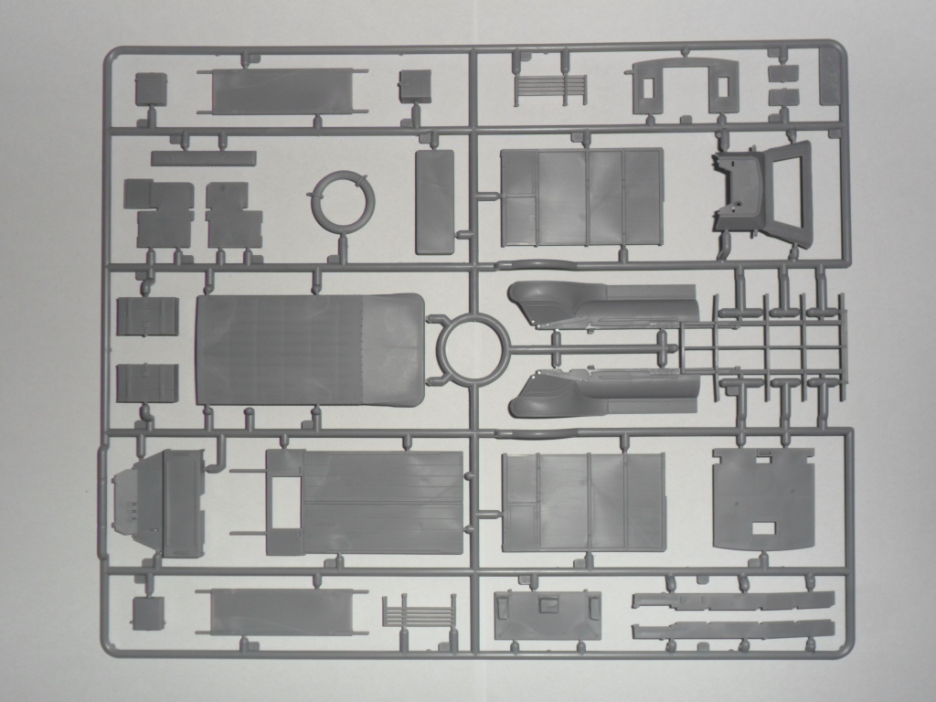 Сборная высокодетализированная ходовая часть, сборный проработанный двигатель, воспроизведены органы управления в кабине, сборный кузов с носилками и лавками.