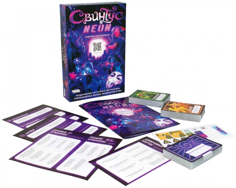 Самое любопытное нововведение в игре "Свинтус Неон" – это то, что карты теперь могут заговорить с вами! Если, конечно, вы этого захотите, и поможете им в этом. Достаточно перейти по ссылке с QR-кода, и вот уже звучит таинственная история, которую искусственный интеллект специально отыскал для вас.