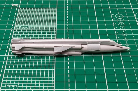 Модель можно собрать как в варианте со сложенным оперением, так и в полетном режиме, пилон для подвески на самолеты семейства Су (в частности отлично подойдет для хита от "Звезды" https://armata-models.ru/catalog/istrebiteli/7297/) в комплекте. Длина ракеты 12,5 см, деталей -13