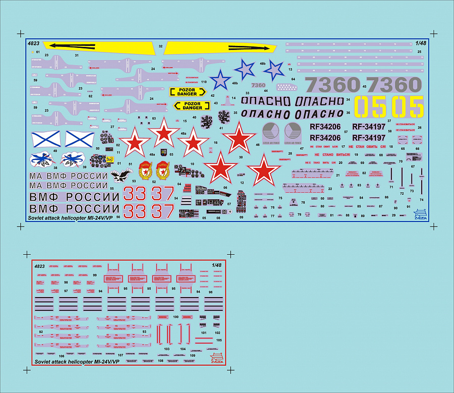 Ударный вертолёт Ми-24 был разработан ОКБ М.Л. Миля в конце 1960-х годов и принят на вооружение Советской Армии в 1976 году. Он стал самой массовой модификацией Ми-24 – их построили около тысячи. Первой войной Ми-24В стал Афганистан, где вертолёт показал себя надёжной, хорошо защищённой и грозной для врага машиной. Кроме бомб и ракет на шести узлах внешней подвески, Ми-24В имеет под передней кабиной, где размещается стрелок - оператор бортового вооружения, поворотную установку с крупнокалиберным 12,7-мм четырёехствольным пулемётом ЯкБ-12,7. Если вместо него Вы решите использовать также имеющуюся в наборе 23-мм двуствольную пушку ГШ-23Л, то получится модификация Ми-24ВП.